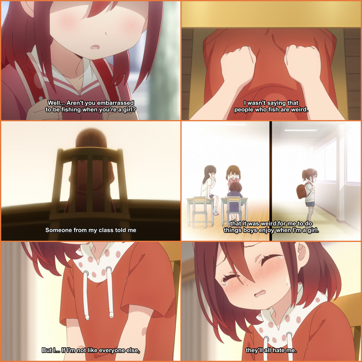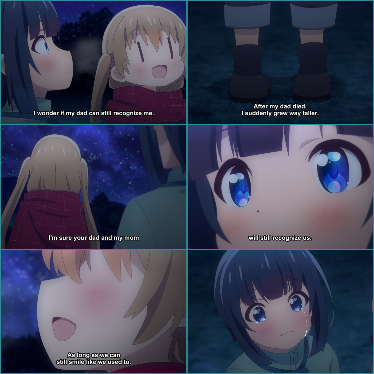 In episode 3, after a day of fishing. Koharu and Hiyori decide to stroll under the stars and admire the grandeur of it all. As any angler in that situation can tell you, it is in moments like that in which the depths of your soul seem to bubble up. Their light-hearted conversation turns into the topic that weighs the heaviest on both of them, the loss of their parents. The way this is depicted and how the environment influences the scene is done so eloquently. The conversation would not have taken place without the scenery around them, which beautifully captures how nurturing nature can be.