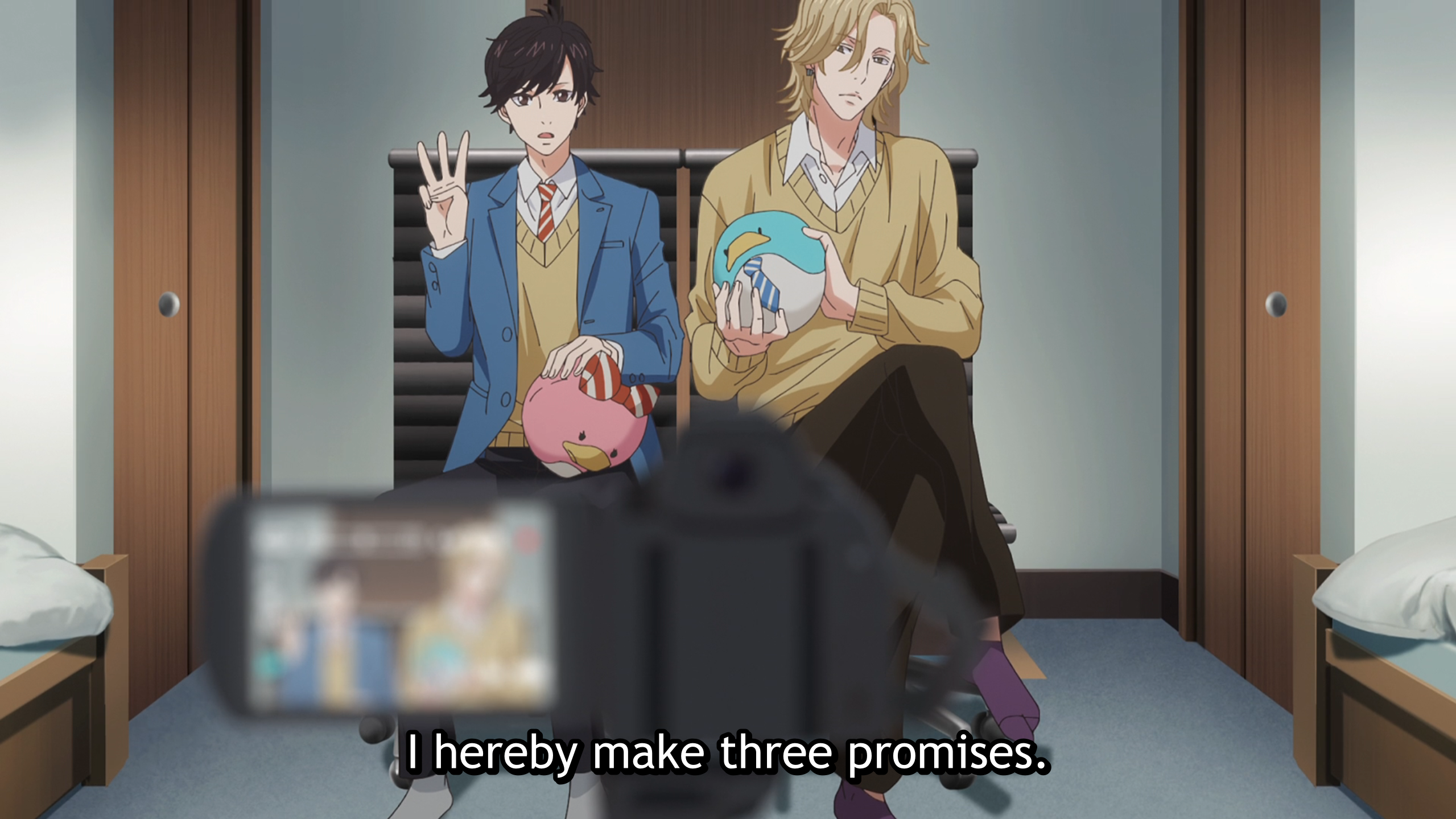 The series starts with roommates Mao Tsuchiya and Hisashi Ootomo making three promises to one another. Mao must not tell anyone that Hisashi is gay and has a boyfriend, Hisashi must never make any moves on Mao or otherwise make him uncomfortable, and neither one of them will disturb the other’s… let’s just say “personal time.” This is how their second year of living together as roommates starts off. During the early days of the school year, the film club for which Mao is an Assistant Director decides to put on a BL film for their project that year, and the head of the club wants to cast Hisashi as the lead. Mao resists asking him to take part out of fear that doing so would make Hisashi think he had told the film club about him being gay, but, through sheer happenstance, the head of the film club runs into Hisashi and talks to him about the role, which he excitedly accepts.